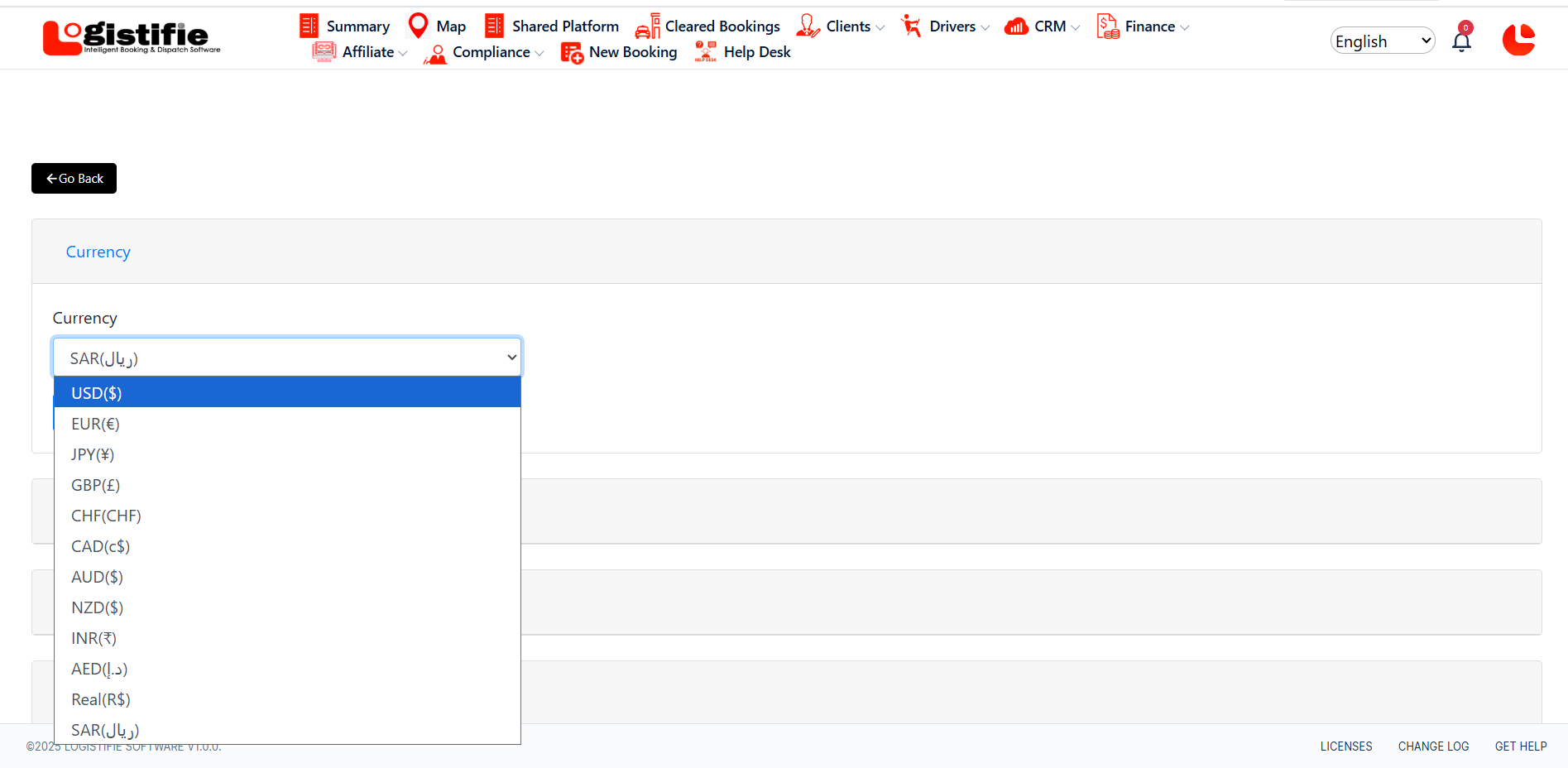 Note: Make sure to set your currency before processing any bookings or invoices to avoid mismatch in financial data.Setting the correct timezone is crucial for accurate job scheduling, driver assignments, and client communications.