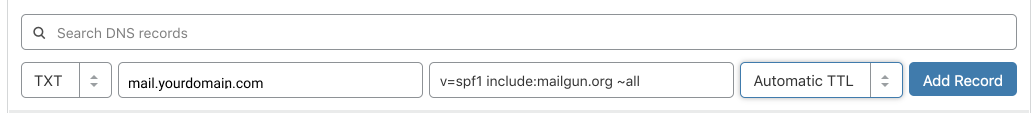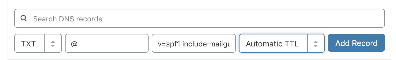 Instead, you will insert the value include:mailgun.org into your existing SPF record. Ensure this value is placed somewhere after v=spf1 and somewhere before ~all. Also, ensure this value has one space character to its left and one space character to its right.