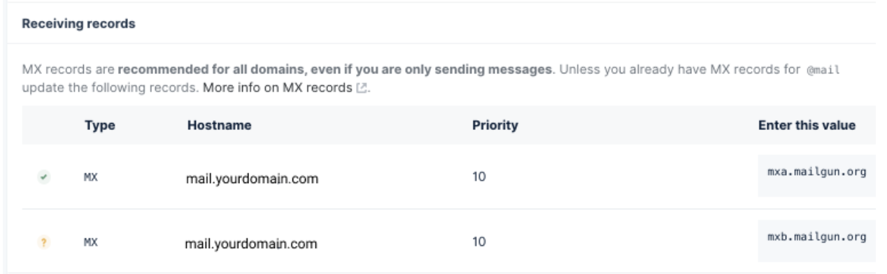 The first records Mailgun requires are TXT records. You'll need to add two separate TXT records, one for SPF and one for DKIM. These are essential for sending and receiving email with Mailgun.