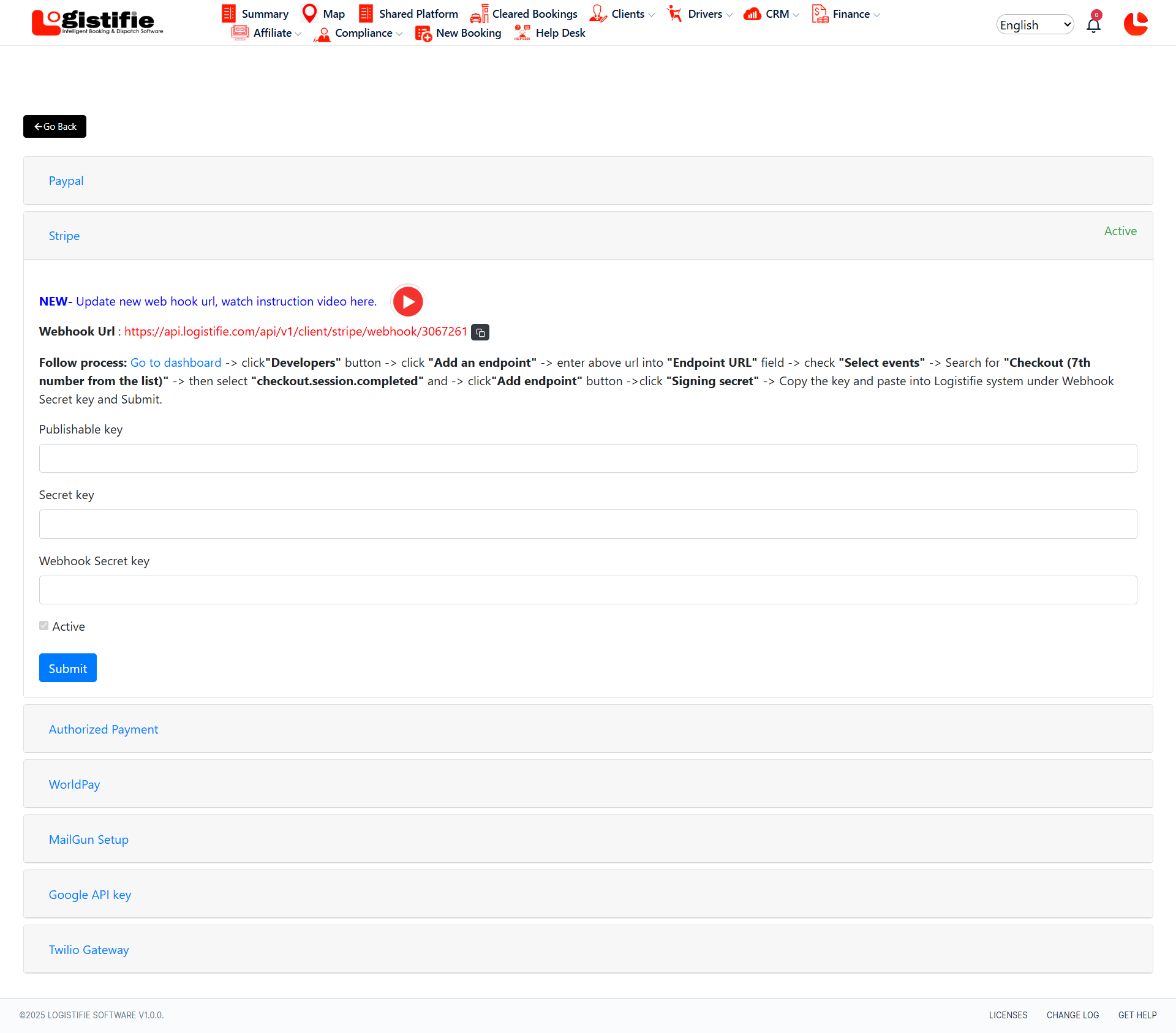 Paste these keys into the respective fields in the Logistifie integration panel under Stripe.